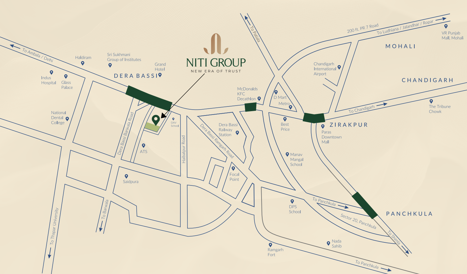 After delivering a premium commercial complex and a 23-acre residential township, fully sold out, Niti Group now introduces its upcoming residential project near the Chandigarh–Ambala Highway, Derabassi. Strategically located in a fast-growing area, the project offers excellent connectivity to Chandigarh, Mohali, and Zirakpur while maintaining a peaceful residential environment.